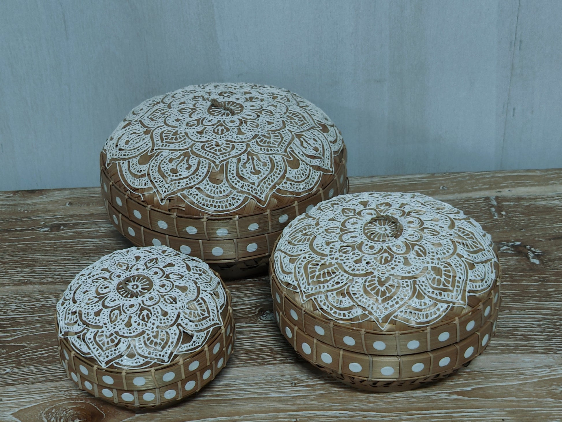 211103 Lage bamboe bakje rond wit geschilderd set van 3