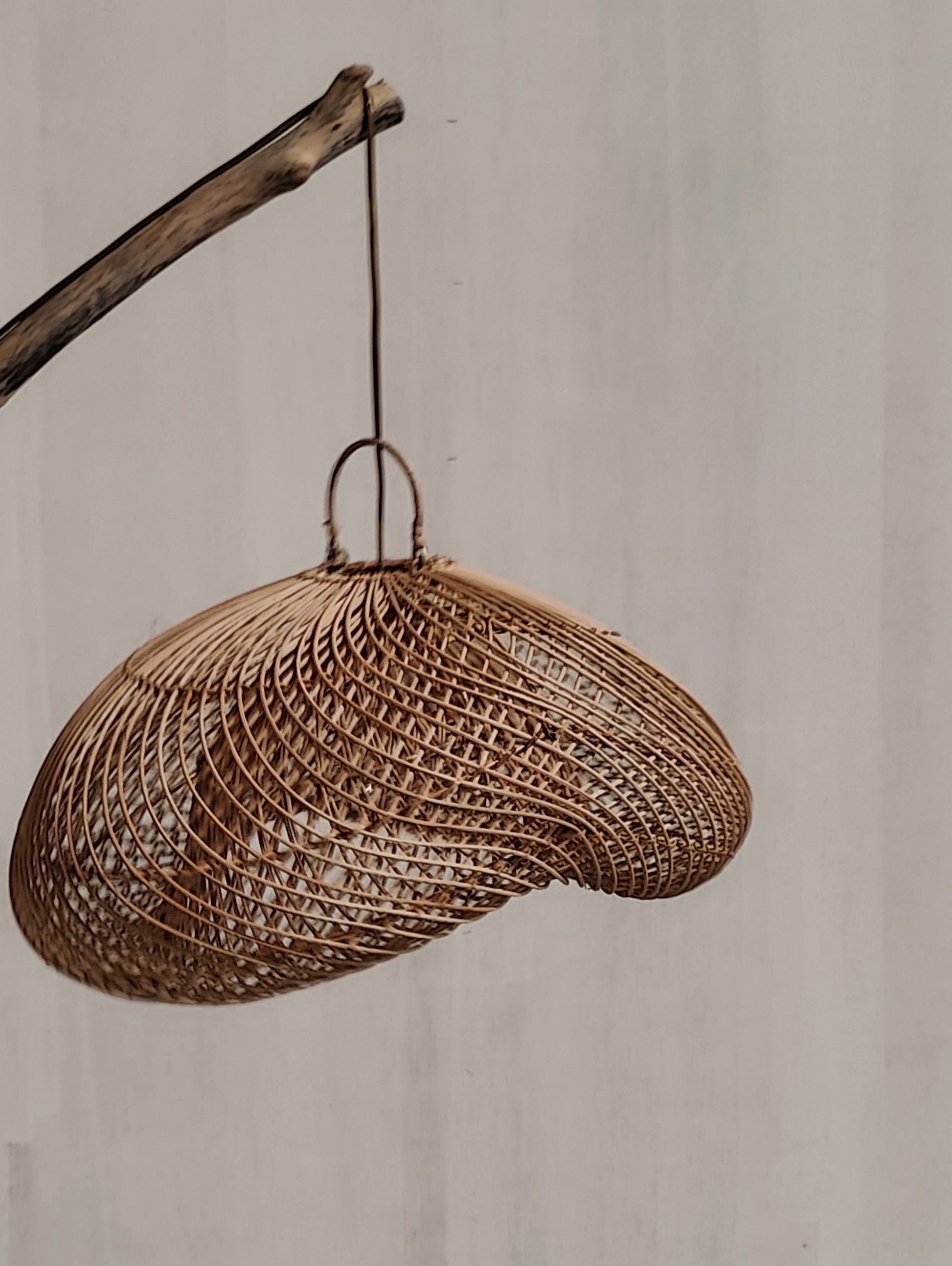 Deze rotan lamp uit Bali heeft een golvend, organisch ontwerp dat de schoonheid van de natuur weerspiegelt. Het frame is vakkundig geweven van hoogwaardig rotan, met golvende lijnen die zich elegant door de ruimte slingeren, waardoor een dynamisch en rustiek effect ontstaat. Het patroon van de lamp lijkt zachtjes in beweging, waardoor het licht dat erdoorheen schijnt een sfeervol, golvend effect op de omgeving creëert. De lamp heeft een warme, uitnodigende uitstraling en past perfect in een bohemian, tropisch of minimalistisch interieur. De natuurlijke tinten van het rotan brengen een rustige en verfijnde Bali-sfeer in je huis, terwijl de golvende vorm zorgt voor een speelse en unieke touch.
