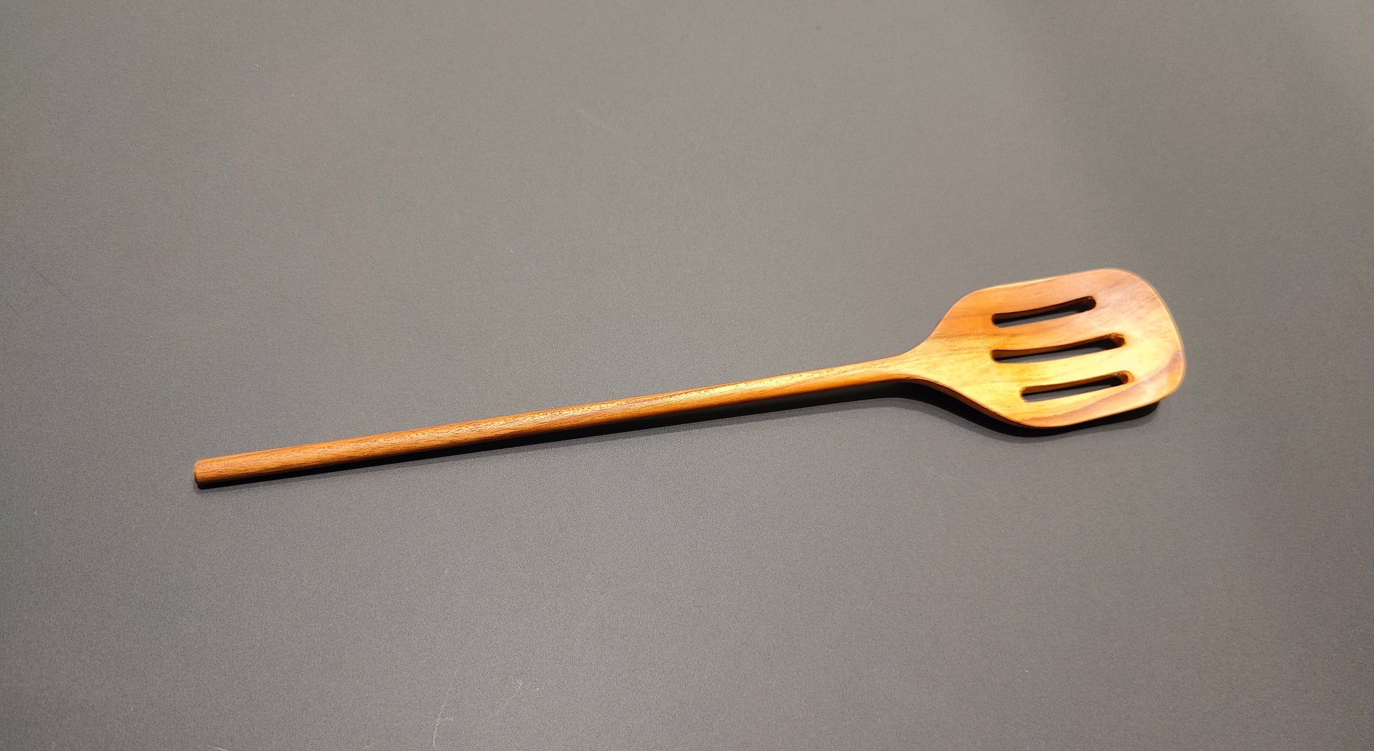 Een stevige hardhouten spatel met een lengte van ca 28 cm. Voorzien van drie lijn gaten. Deze spatel is perfect voor dagelijks gebruik in de keuken, met een duurzaam en ergonomisch ontwerp dat goed in de hand ligt. Het stevige hout zorgt voor een lange levensduur, terwijl de gladde afwerking het gebruik comfortabel maakt voor het roeren, mengen of serveren van voedsel
