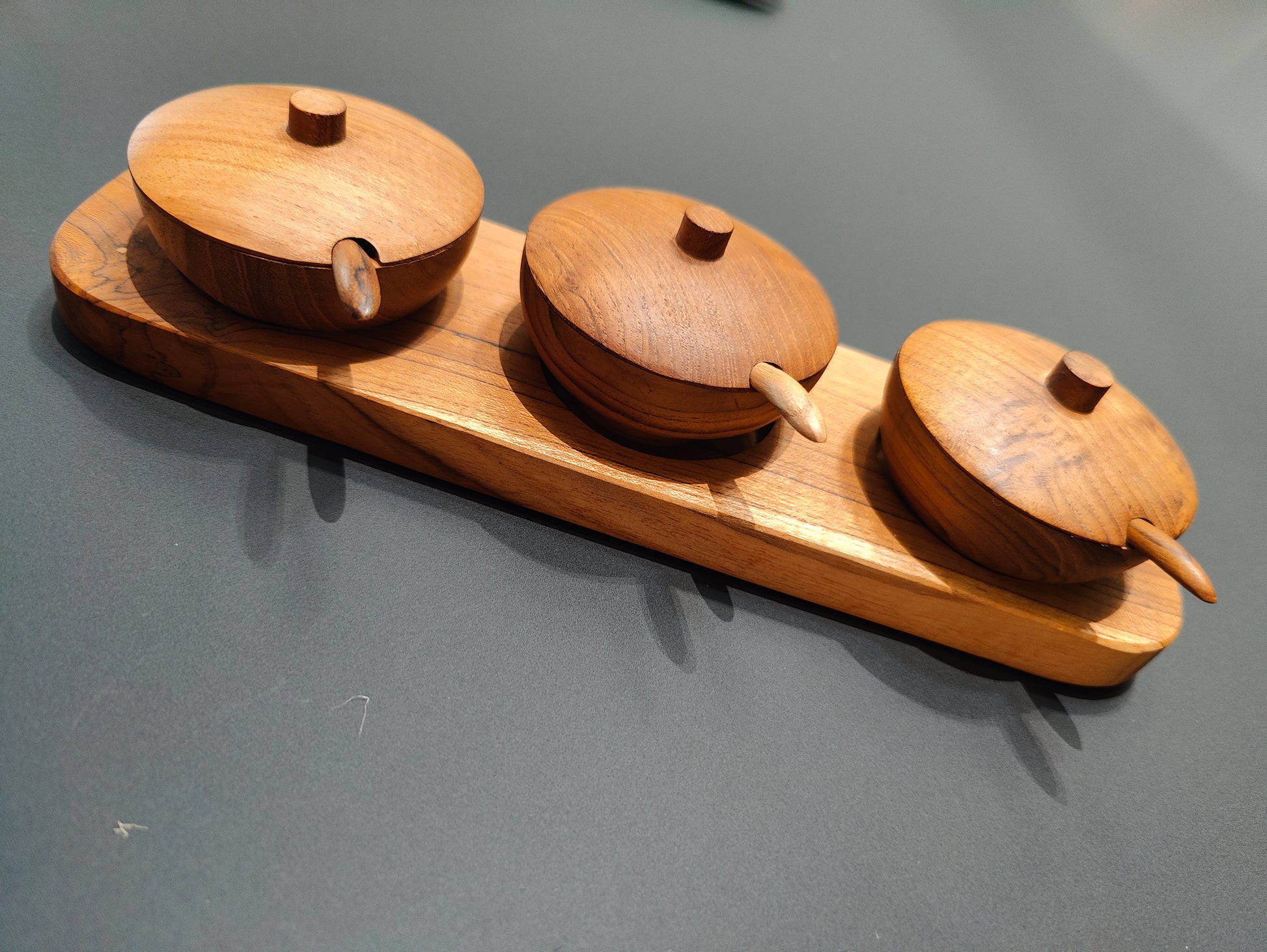 Set van drie hardhouten kruidenpotjes, gepresenteerd op een stevig plankje. De potjes hebben een natuurlijke, rustieke uitstraling en zijn perfect voor het bewaren van kruiden of specerijen. Het eenvoudige plankje biedt een mooie, functionele manier om de potjes overzichtelijk en stijlvol te presenteren in je keuken of op een ander plek in huis