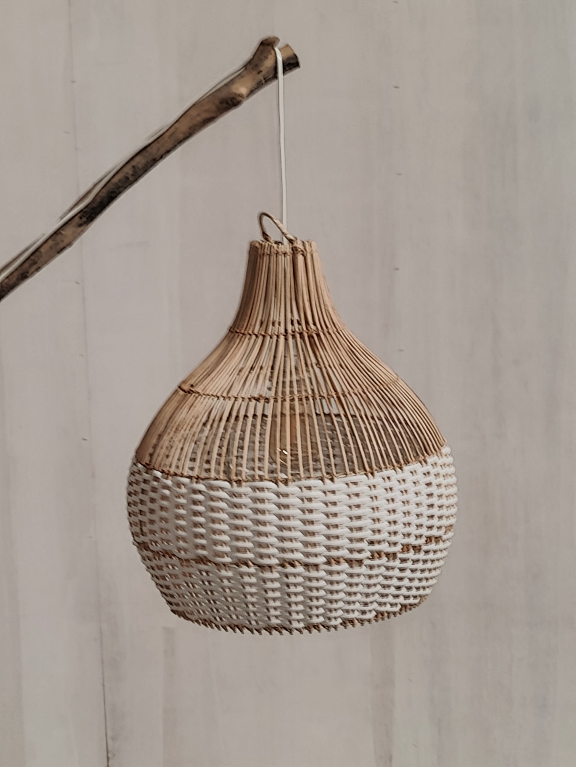 Deze naturelkleurige rotan lamp met witte onderrand heeft een diameter van 40 cm en straalt een warme, exotische sfeer uit. Het ontwerp is verfijnd en handgemaakt, met een fijne weving van wit rotan die een elegant patroon vormt. Het strakke, maar organische uiterlijk van de lamp voegt een natuurlijke en rustieke charme toe aan elke ruimte. Het licht dat door de openingen van het rotan schijnt, creëert een sfeervolle, gedempte gloed, perfect voor een gezellige en uitnodigende ambiance. Deze lamp is ideaal voor zowel moderne als meer traditionele interieurs en geeft een vleugje Bali-stijl aan je huis.