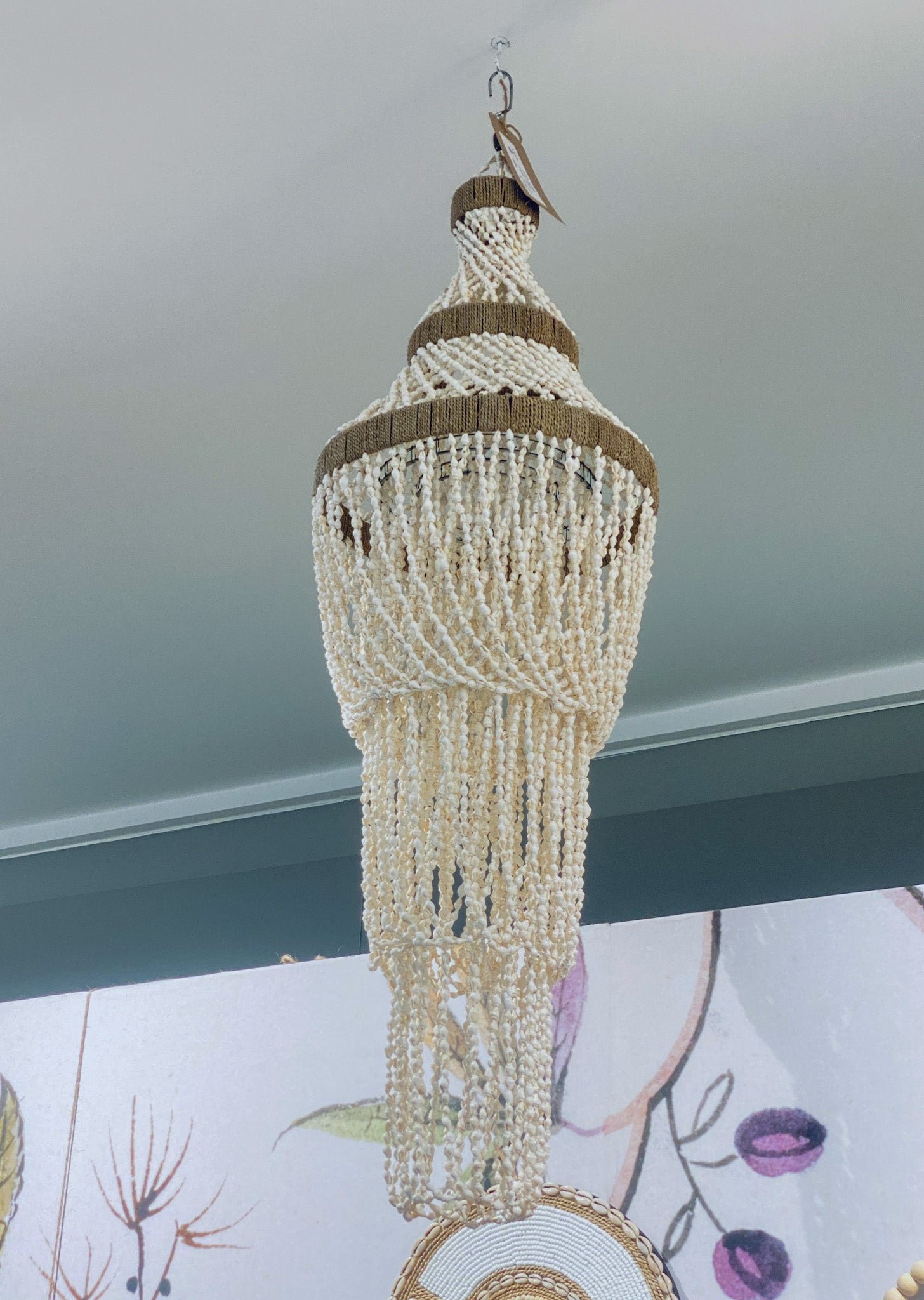 Een schelpenlamp uit Bali zonder verlichting is een decoratief object gemaakt van natuurlijke schelpen, vaak met een opengewerkt of gelaagd ontwerp. Het heeft de vorm van een traditionele lamp, maar dient puur als ornament. De schelpen, zoals kauri of capiz, worden met de hand verwerkt in patronen die een speelse textuur en tropische uitstraling creëren. Dit type decoratie wordt vaak gebruikt in bohemian of kustinterieurs, waarbij het natuurlijke en ambachtelijke karakter van Bali centraal staat. diameter ca 30 cm hoogte ca. 105 cm