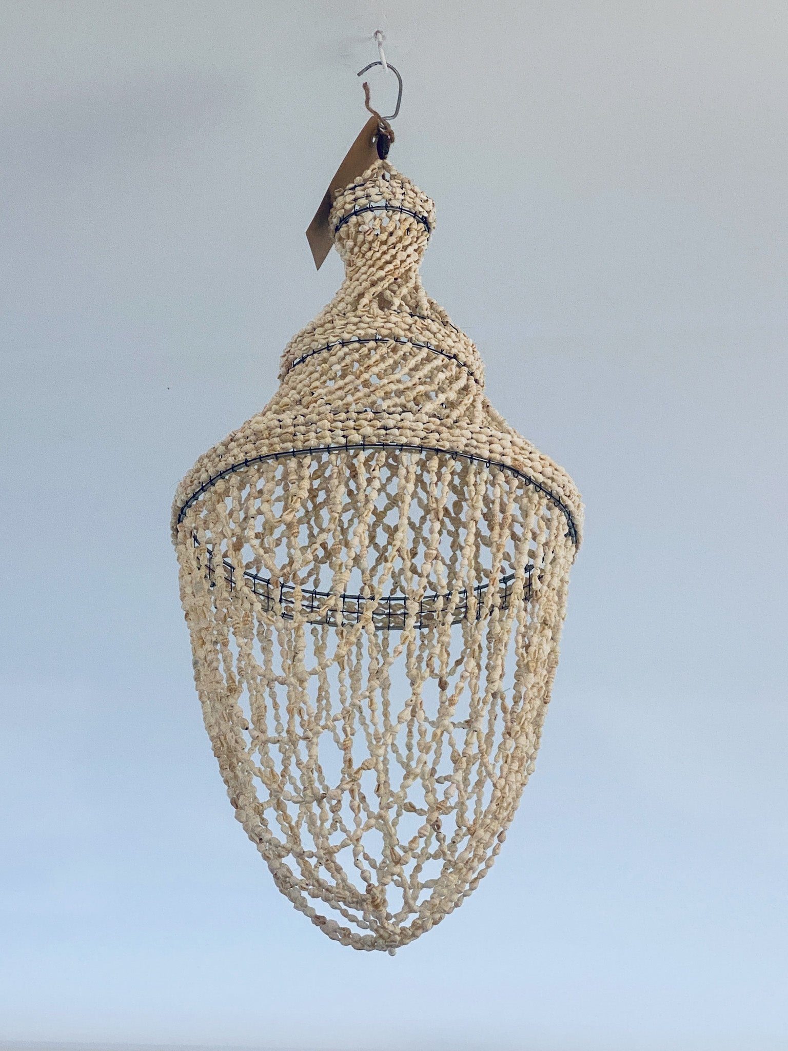 Een schelpenlamp uit Bali zonder verlichting is een decoratief object gemaakt van natuurlijke schelpen, vaak met een opengewerkt of gelaagd ontwerp. Het heeft de vorm van een traditionele lamp, maar dient puur als ornament. De schelpen, zoals kauri of capiz, worden met de hand verwerkt in patronen die een speelse textuur en tropische uitstraling creëren. Dit type decoratie wordt vaak gebruikt in bohemian of kustinterieurs, waarbij het natuurlijke en ambachtelijke karakter van Bali centraal staat.