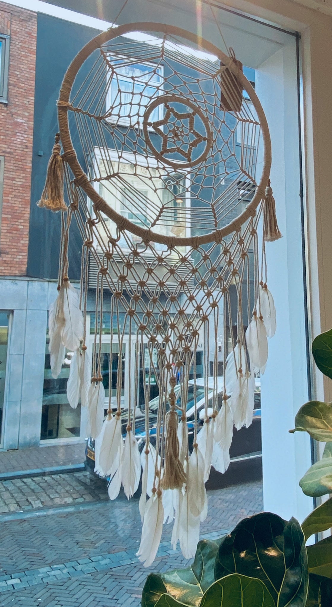 De makramée spider dromenvanger van 145 cm (artikelnummer 500012) is een grote, handgeknoopte dromenvanger met een uniek spinnenweb-patroon in het midden. Dit decoratieve stuk combineert traditionele dromenvanger-symboliek met de kunst van macramé.