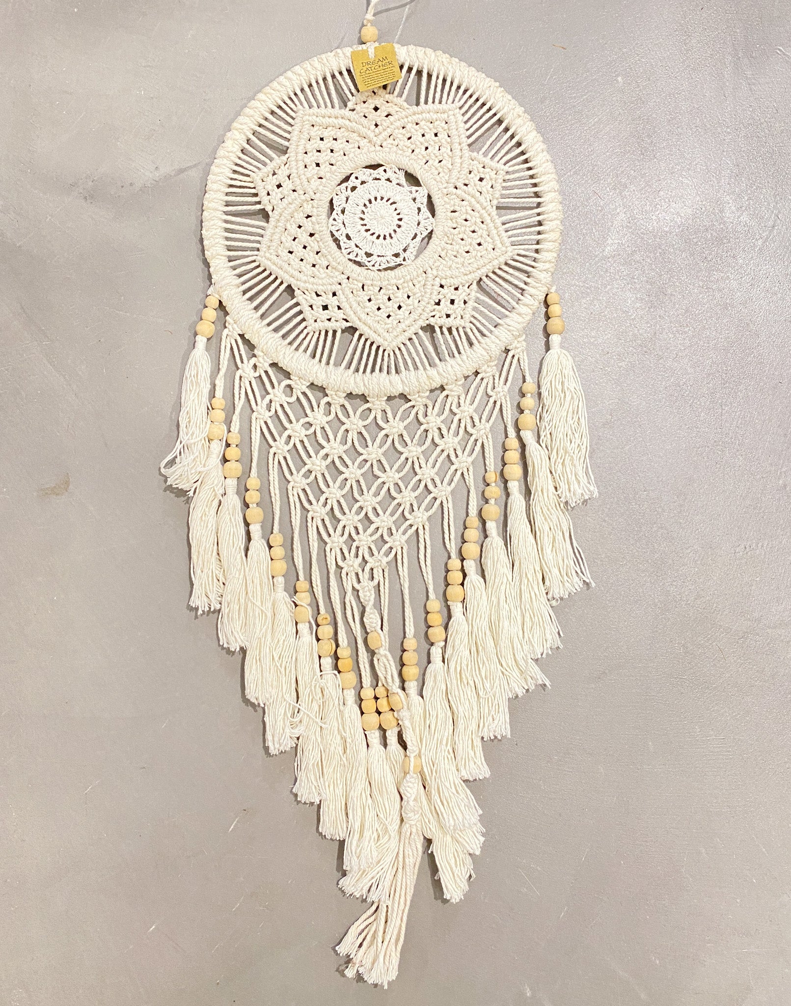 Een dromenvanger uit Bali is een spiritueel en decoratief object, vaak gebruikt om negatieve energieën of slechte dromen af te weren. Het ontwerp bestaat meestal uit een houten ring, waarop een web van draden is geweven. Deze webstructuur is vaak versierd met veren, kralen, schelpen en soms kleurige stoffen. De dromenvanger hangt vaak aan een touw of leren koord en wordt meestal boven het bed of in een andere rustige ruimte geplaatst.