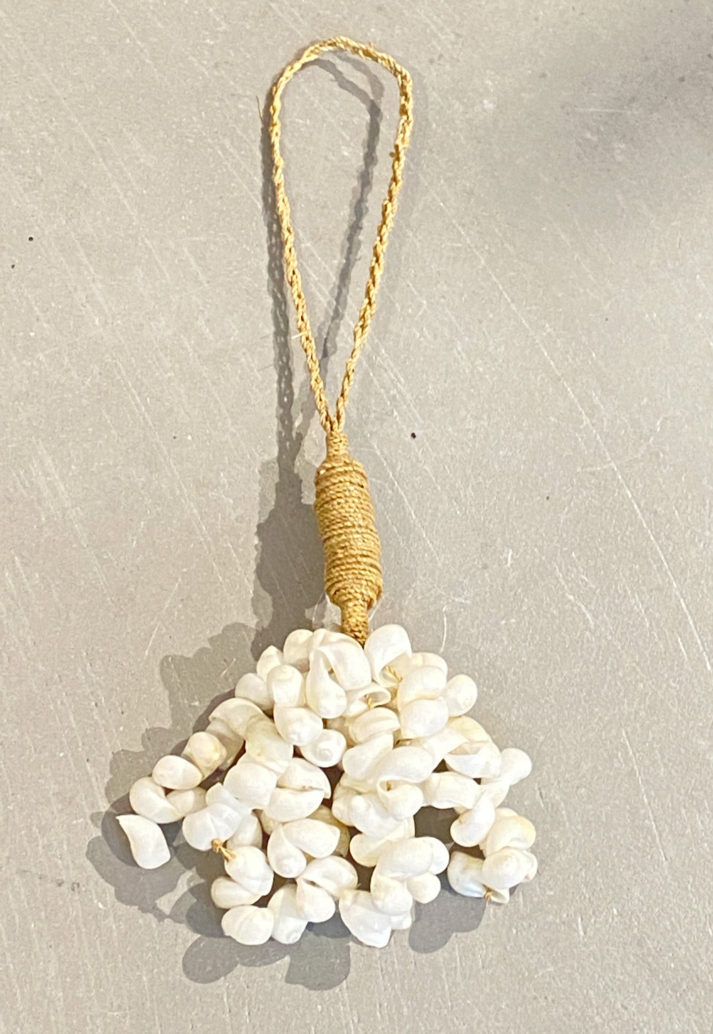 Een Balinese schelpenhanger is een handgemaakt accessoire, vaak gebruikt als decoratie of sieradenhanger. Gemaakt van natuurlijke schelpen zoals kauri of capiz, wordt het vaak gecombineerd met kralen, touw of geweven vezels. De hanger kan variëren van eenvoudige strengen tot complexe patronen en wordt gebruikt als wanddecoratie, gordijnhanger of spiritueel symbool.