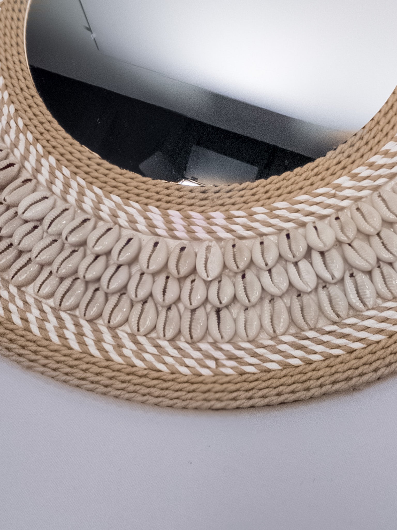 Deze prachtige Balinese spiegel heeft een unieke uitstraling dankzij de handgemaakte rand, die is versierd met verfijnde schelpen. Met een diameter van 40 cm voegt de spiegel een exotisch en tropisch element toe aan elke ruimte. Het gebruik van natuurlijke materialen geeft de spiegel een rustieke charme, ideaal voor het versterken van een bohemien, kust- of Balinese stijl in je interieur. Perfect voor zowel functionele als decoratieve doeleinden in je huis