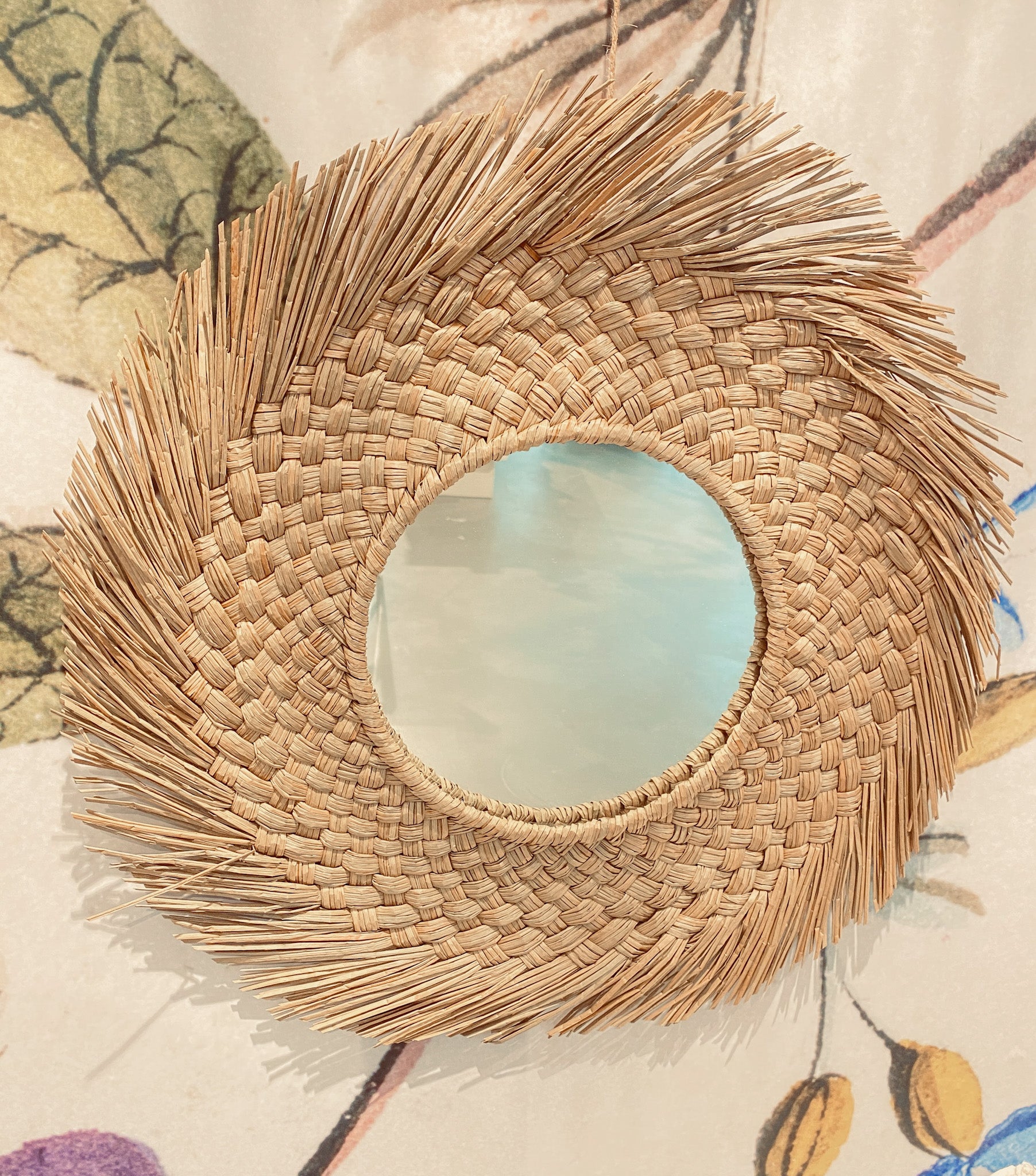 Deze Balinese spiegel heeft een rieten rand en een diameter van 50 cm. Het natuurlijke riet geeft de spiegel een tropische, rustieke uitstraling, perfect voor het toevoegen van een exotisch accent aan je interieur