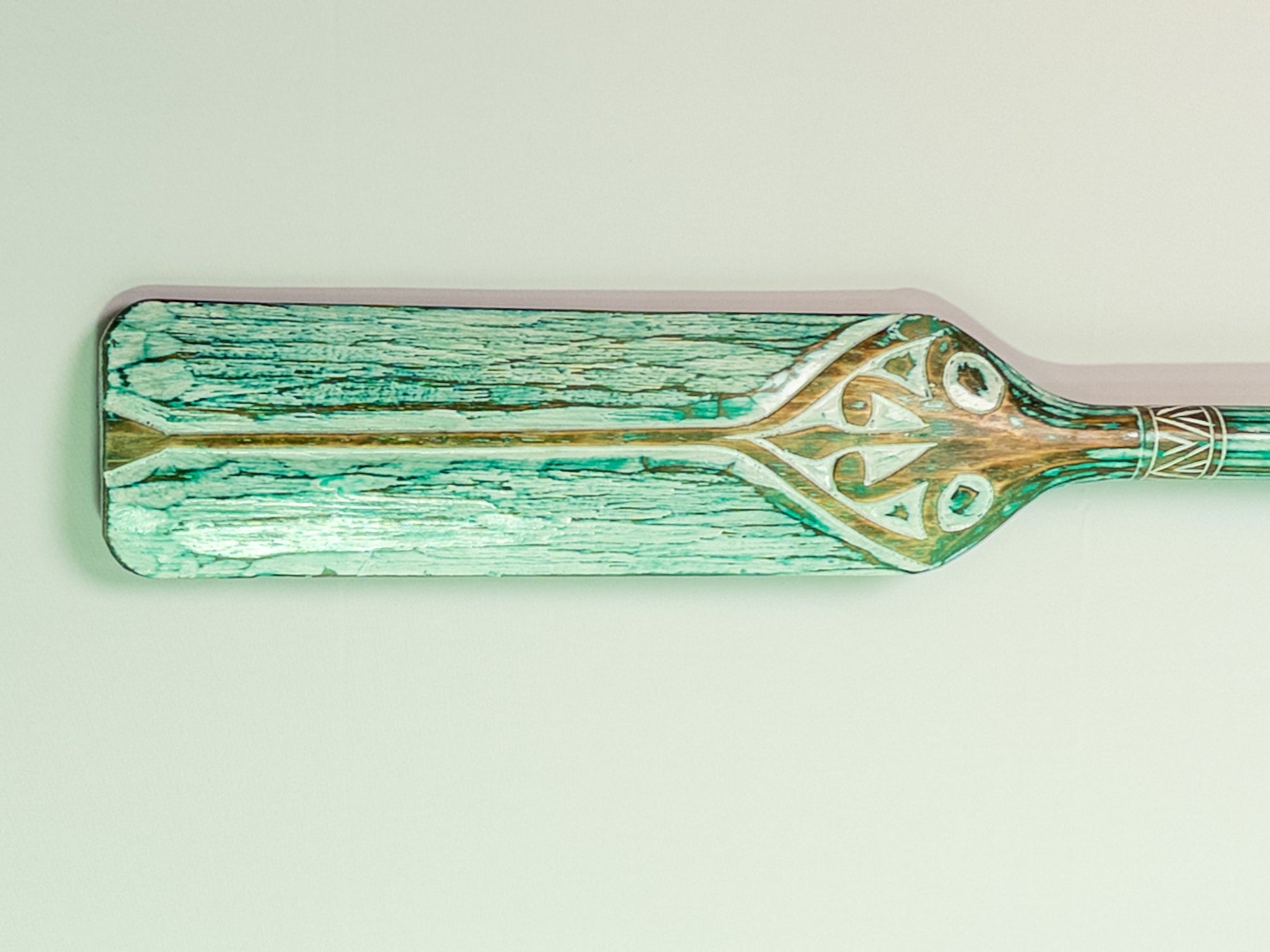 Deze decoratieve peddel uit Bali heeft een prachtige turquoise kleur met witte accenten, wat een frisse en exotische uitstraling geeft. Perfect voor het toevoegen van een tropisch element aan je interieur of als opvallend decoratief stuk ca 1.00 mtr hoog