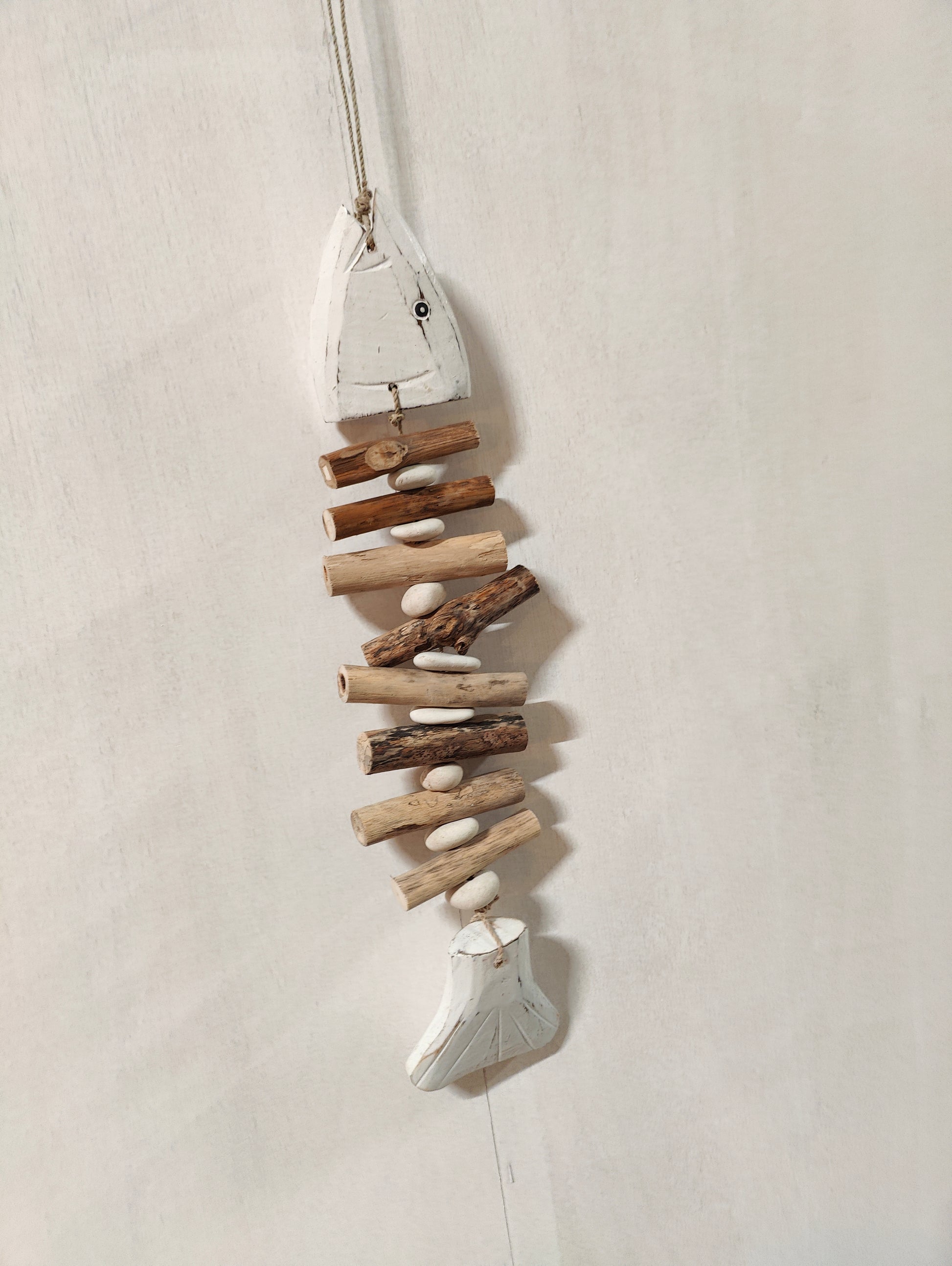 Deze hanger van 45 cm in de vorm van een witte vis is een prachtig decoratief stuk dat een kalme en rustgevende uitstraling geeft. Het ontwerp, eenvoudig maar elegant, kan een symbolische betekenis van vrijheid en sereniteit uitstralen. De witte kleur maakt het veelzijdig en gemakkelijk te combineren met verschillende interieurstijlen, van kust- of boho tot minimalistisch. De vis kan een subtiele, maar opvallende toevoeging zijn aan een wand, raam of zelfs als een sfeervol element in een buitentuin of veranda. Het is een perfecte manier om een maritieme of tropische sfeer in huis te brengen.
