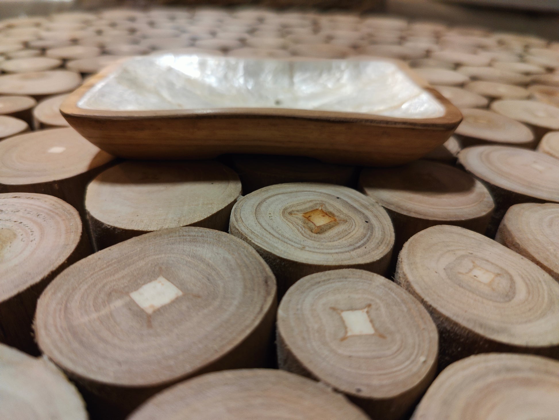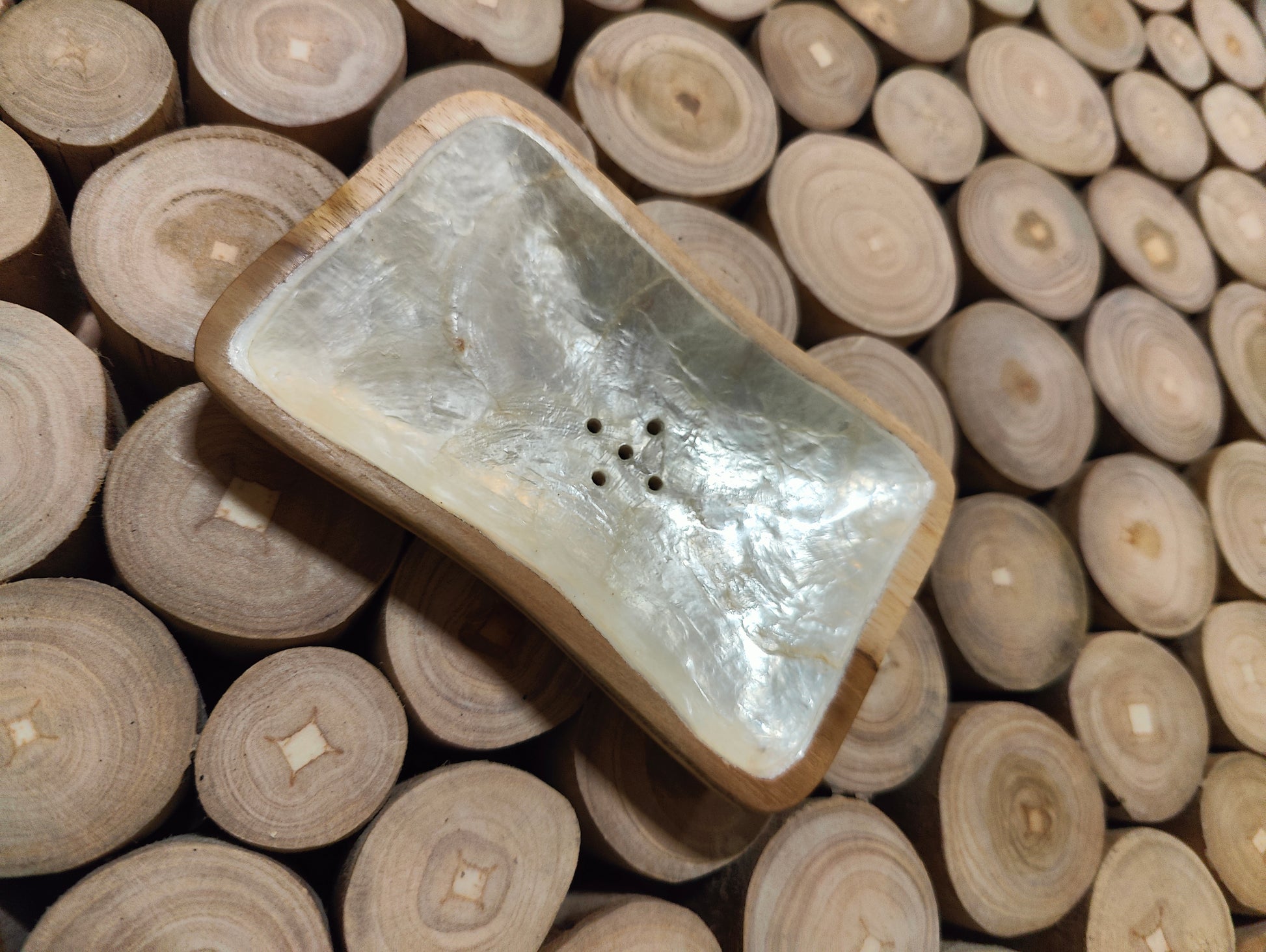 Dit zeepbakje is gemaakt van hardhout en heeft een elegante afwerking met parelmoer details. Het zeepbakje is 13 cm lang, 8 cm breed en 2 cm dik, wat het een compacte en functionele maat maakt voor gebruik in de badkamer of keuken. De gaatjes in het bakje zorgen voor een goede waterafvoer, zodat zeep snel droogt en niet week wordt, wat de levensduur van de zeep verlengt. De combinatie van het robuuste hardhout en de glans van het parelmoer geeft het een luxe en natuurlijke uitstraling, perfect voor een rustiek of tropisch geïnspireerd interieur. Het is niet alleen praktisch, maar ook een verfijnd decoratief element voor je badkamer.
