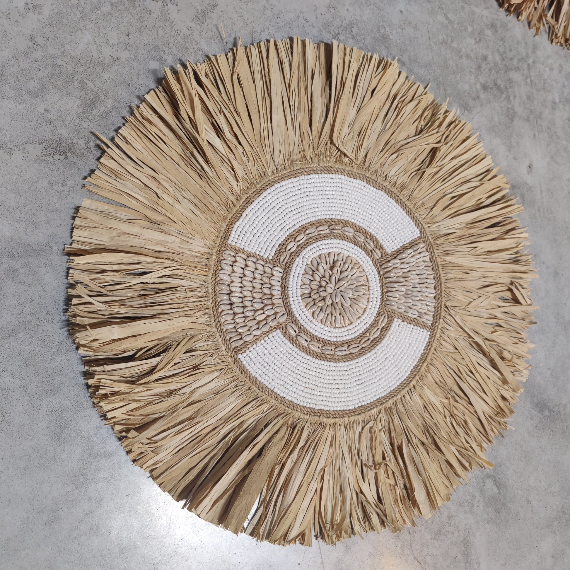 In het midden van de rieten cirkel bevinden zich decoratieve patronen van beige schelpen en witte kralen. De schelpen hebben zachte aardetinten die prachtig contrasteren met de helderheid van de kralen. De kralen vormen vaak een symmetrisch patroon of accentueren de ronde vorm, wat de decoratie een verfijnde en evenwichtige uitstraling geeft.