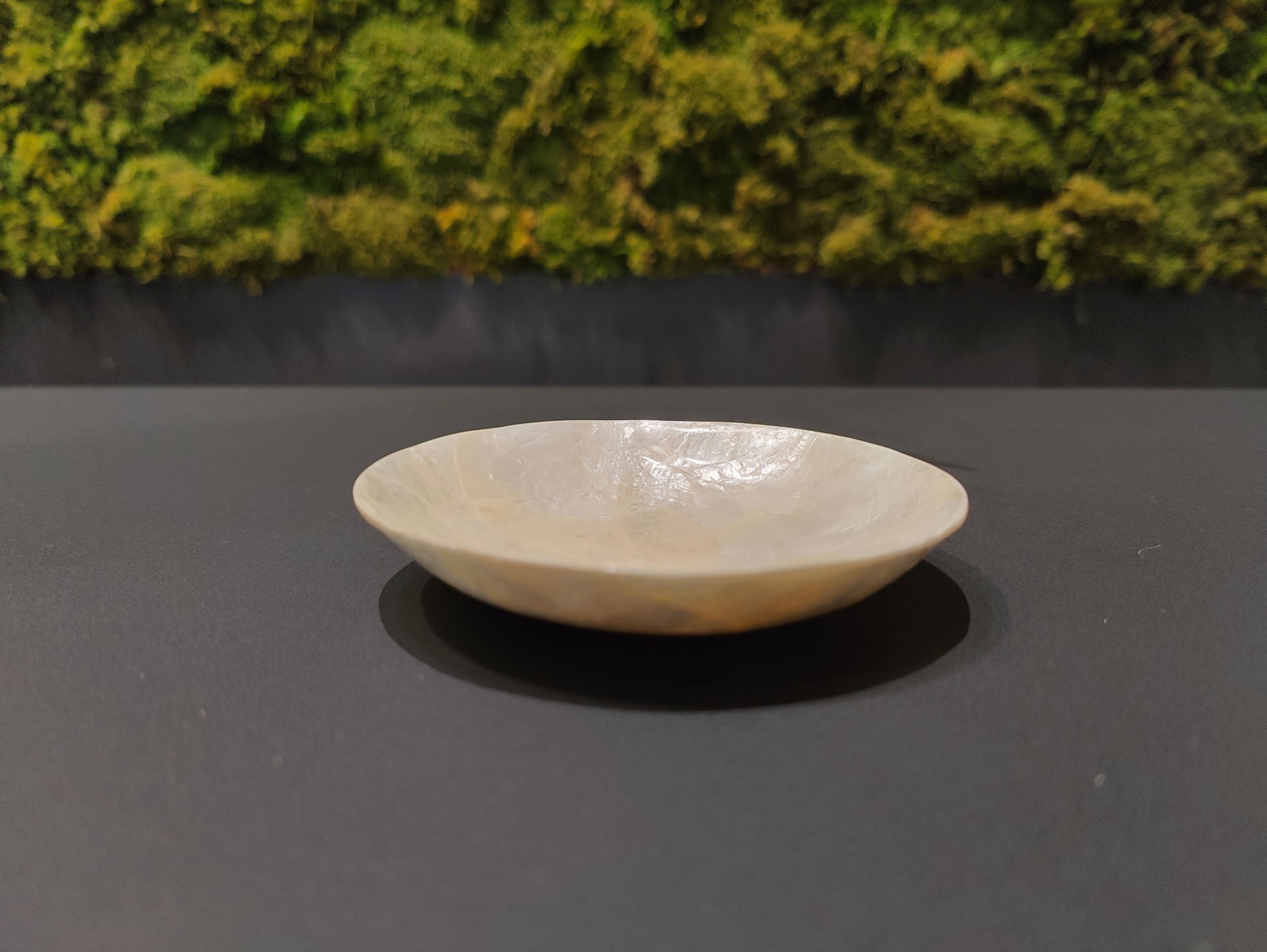 Een amuseschaaltje van parelmoer met een diameter van 11 cm is een verfijnd, glanzend bordje dat luxe en elegantie uitstraalt. Het is rond van vorm, slank en licht, met een glad oppervlak dat subtiel oplicht in iriserende tinten zoals wit, crème, zilver, afhankelijk van hoe het licht erop valt.