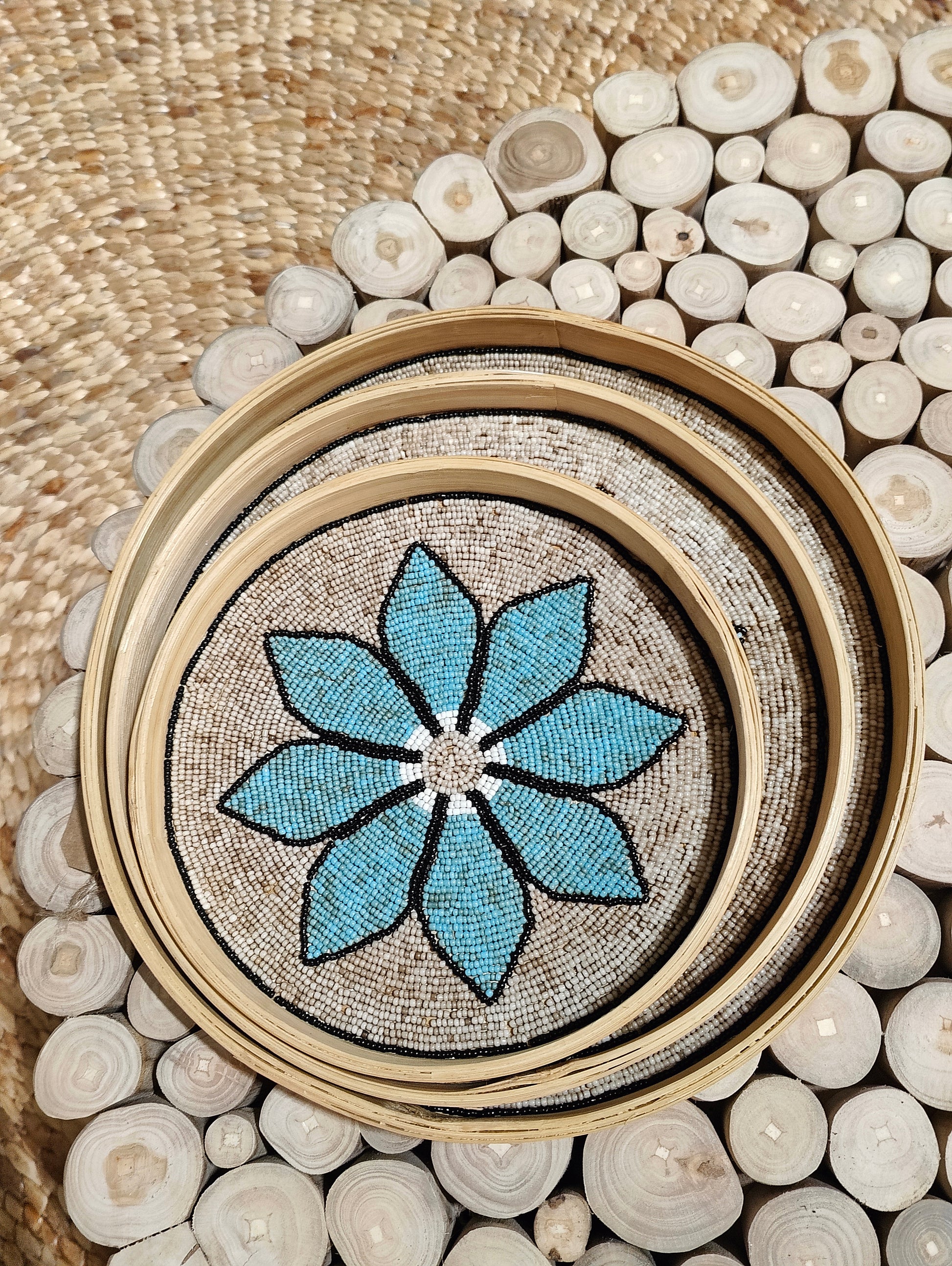 . De aqua tinten brengen een frisse, rustgevende uitstraling die doet denken aan water en tropische sferen. De combinatie van het warme, natuurlijke bamboe met de koele, heldere aqua kralen creëert een mooi contrast en maakt deze dienbladen tot een opvallend decoratief stuk.