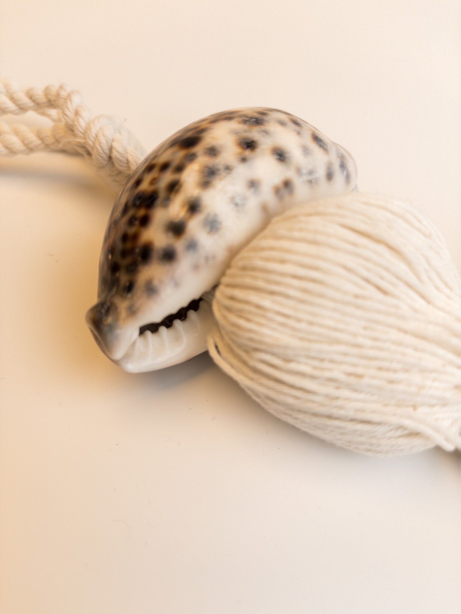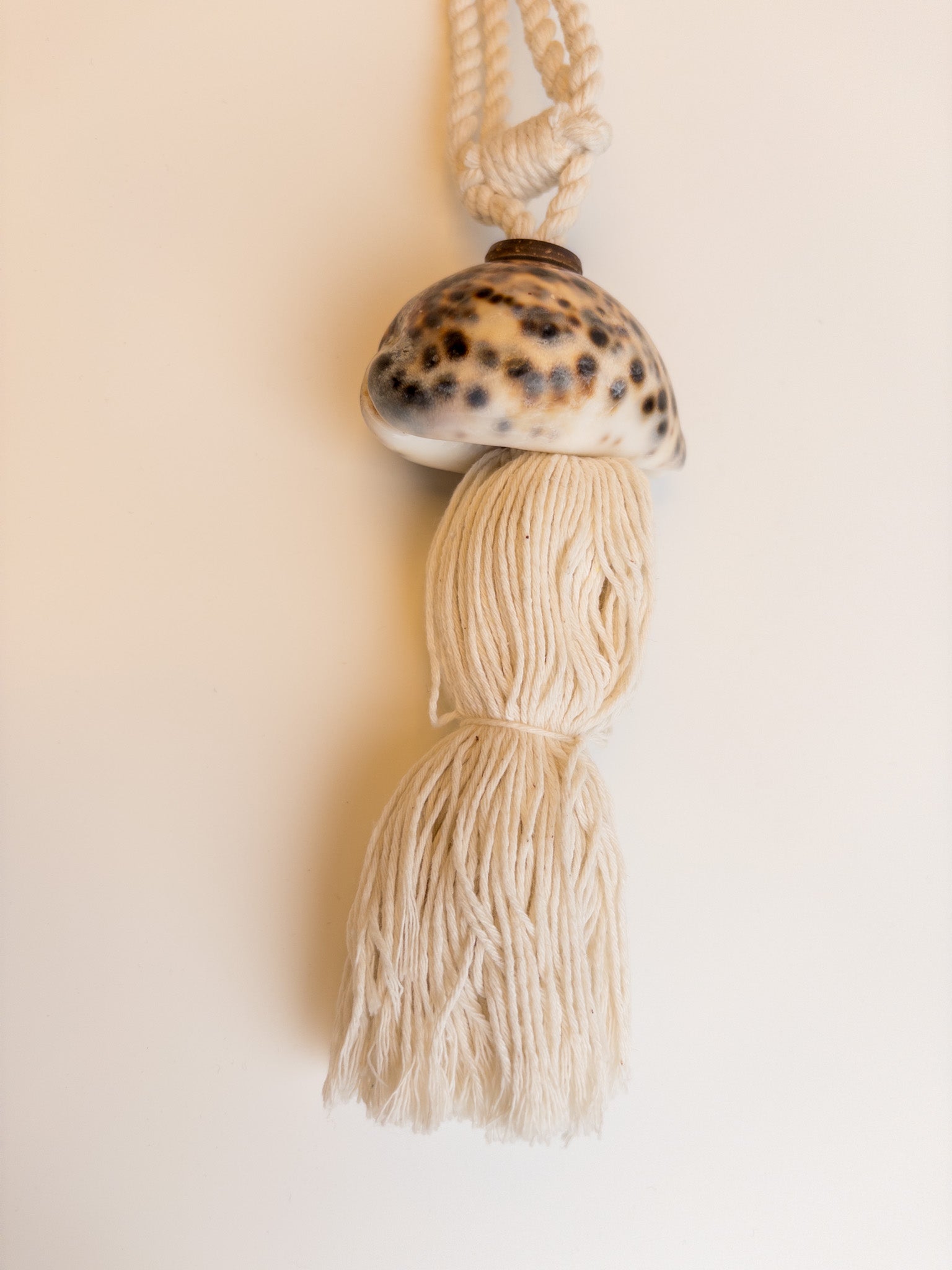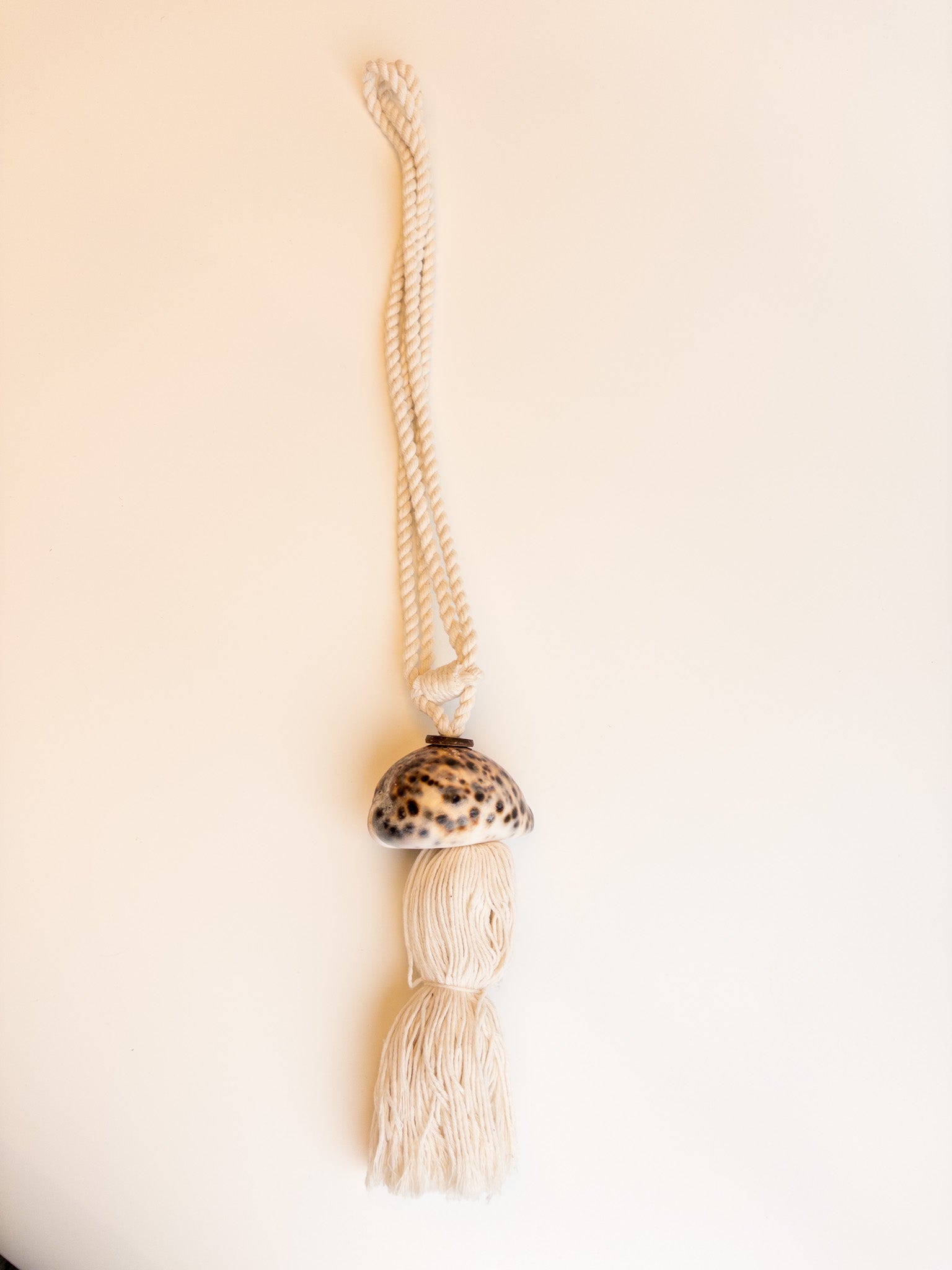 Deze Balinese tijgerschelp is prachtig verwerkt aan een wit koord, wat zorgt voor een natuurlijke en elegante uitstraling. Perfect als decoratief element om een tropische en exotische sfeer aan je interieur toe te voegen