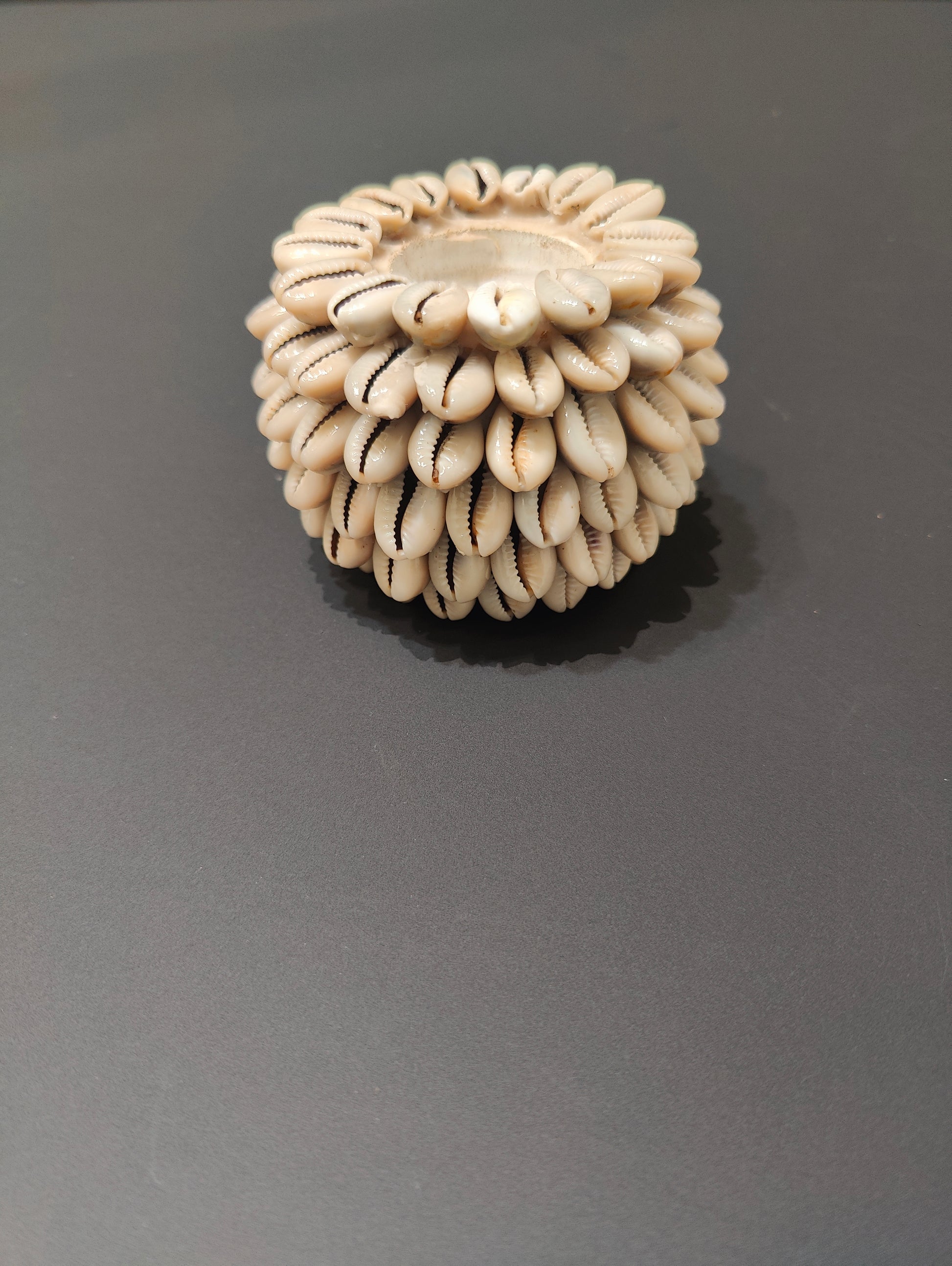De houder heeft een ronde, bolvormige basis die volledig is bedekt met natuurlijke schelpen. De schelpen zijn zorgvuldig gerangschikt in een patroon, De kleuren van de schelpen lopen uiteen van parelmoerwit tot zandkleurig beige, wat zorgt voor een subtiele glans en een warme uitstraling.