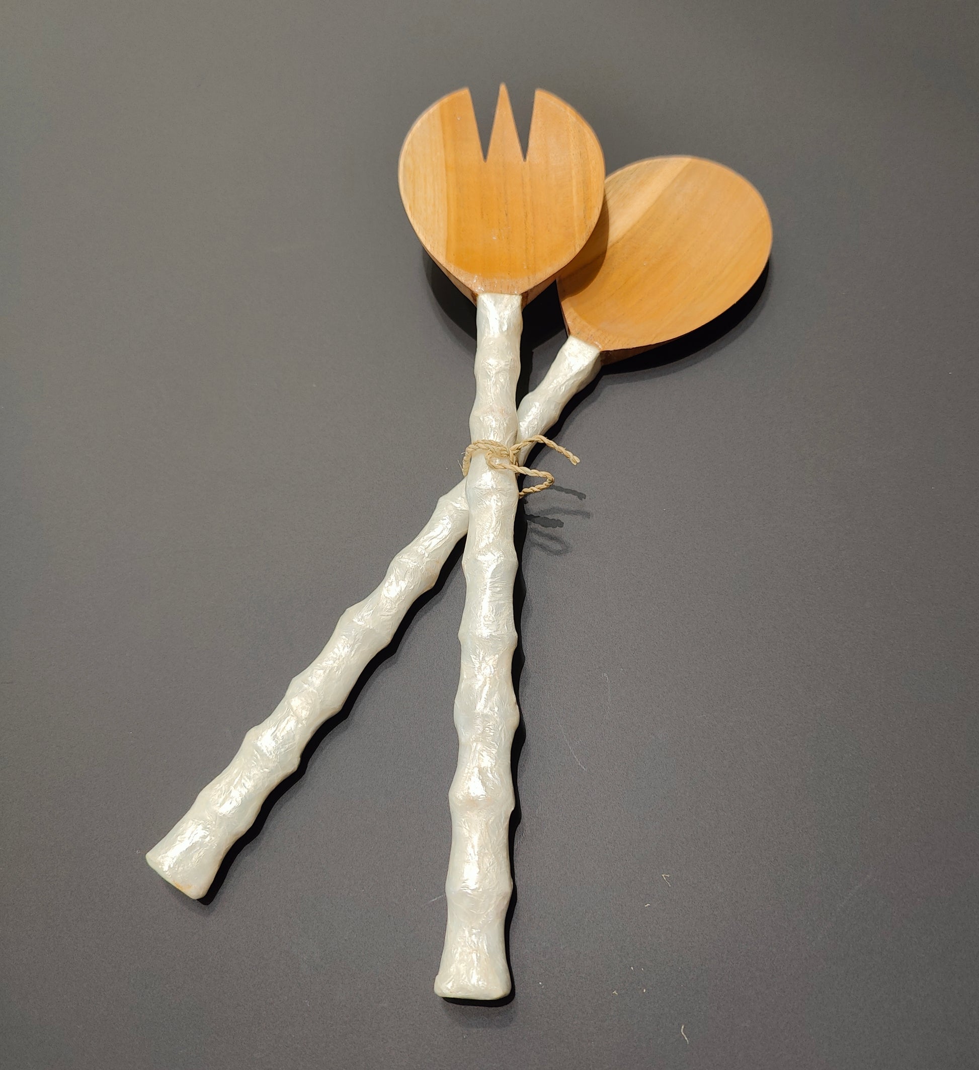 Een hardhouten slacouvert met parelmoeren handvatten is een elegant en verfijnd keukengerei, dat zowel praktisch als esthetisch aantrekkelijk is. Het hout, meestal afkomstig van duurzaam hardhout , is stevig en heeft een mooie, natuurlijke uitstraling met een rijke, donkere kleur en een opvallende nerfstructuur. De uiteinden van de lepel en vork zijn ontworpen om perfect salade te kunnen mengen en serveren, met een comfortabele, ergonomische grip.