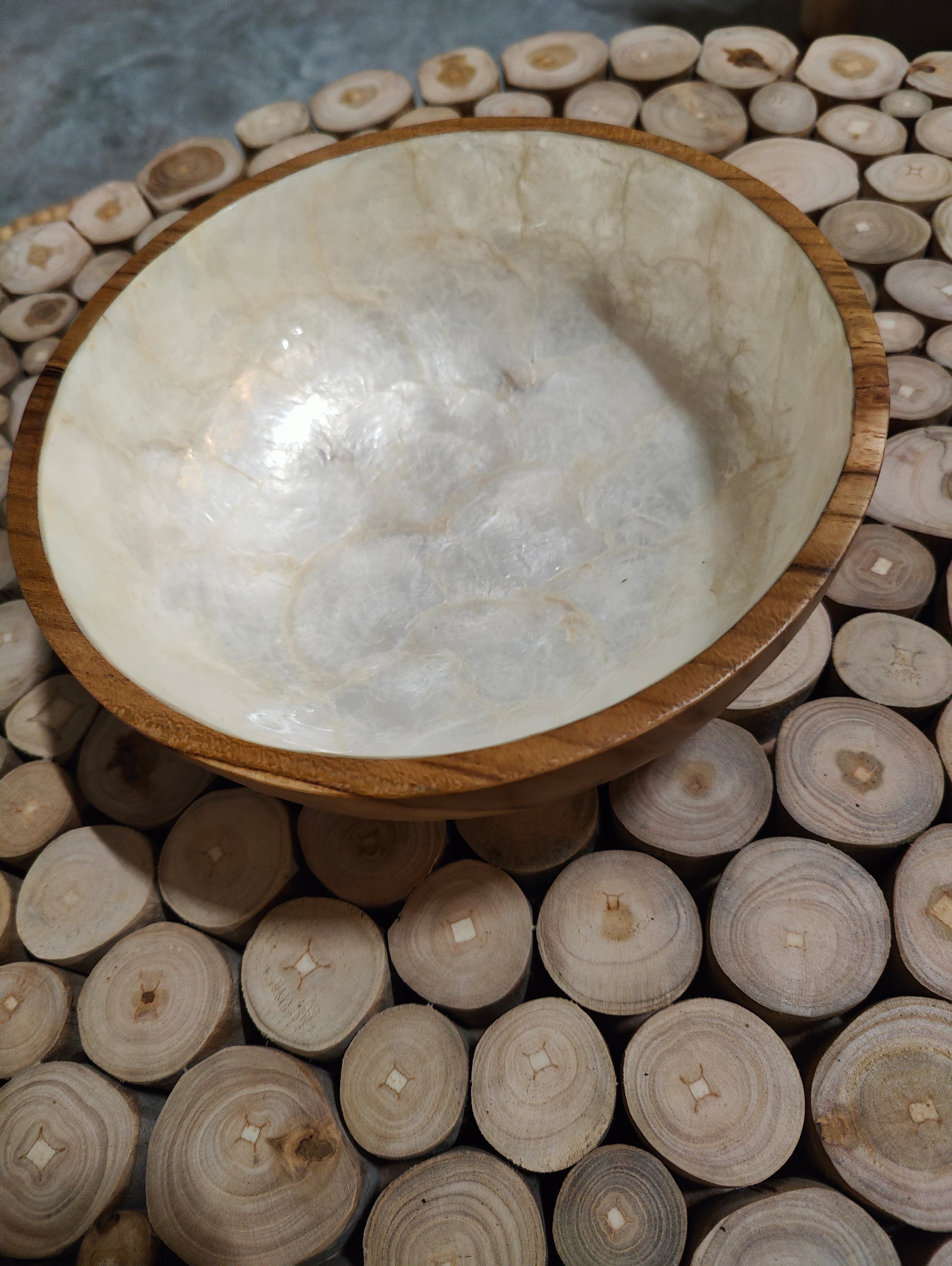 Deze hardhouten slaschaal heeft een prachtige, natuurlijke uitstraling met een luxe twist. Het buitenste gedeelte is gemaakt van stevig hardhout, dat een warme en robuuste uitstraling heeft, perfect voor dagelijks gebruik of speciale gelegenheden. De binnenzijde van de schaal is bekleed met witte paarlemoer, wat een elegante en verfijnde afwerking biedt. Het parelmoer heeft een subtiele glans en een iriserende kwaliteit die prachtig reflecteert bij het vangen van licht, wat de schaal een luxe uitstraling geeft.
