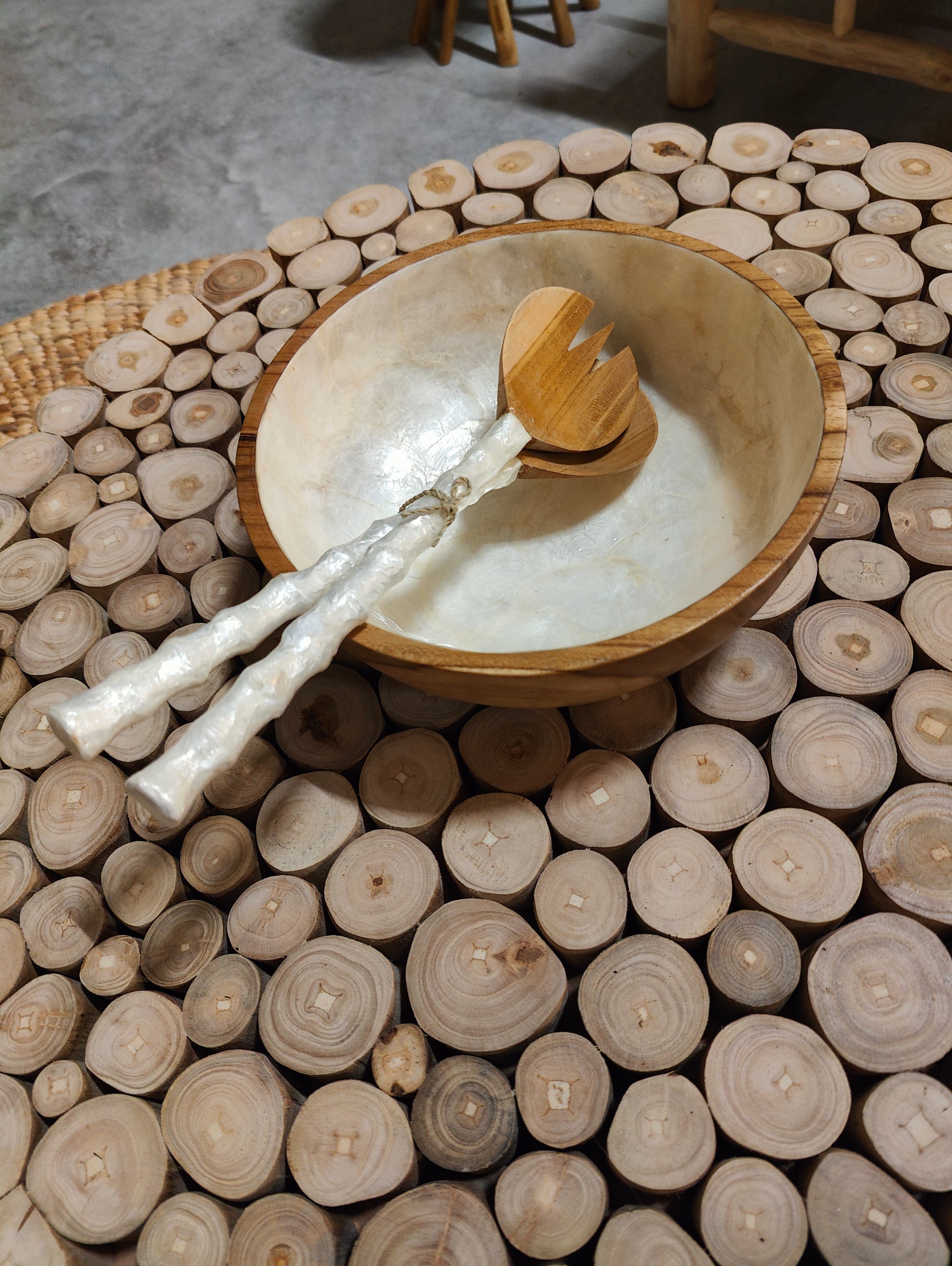 De combinatie van het stoere hardhout aan de buitenkant en de delicate parelmoeren binnenkant zorgt voor een prachtig contrast, waardoor de slaschaal zowel functioneel als decoratief is. Deze schaal is perfect voor het serveren van salades, fruit of andere gerechten en voegt een vleugje verfijning toe aan je eettafel. De set wordt compleet gemaakt met een hardhouten slabestek voorzien van paarlemoer handvatten